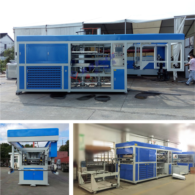 2. 將塑料片材加熱后,在成型站完成成型動作及產(chǎn)品定型,由鏈條將成型后的半成品輸送出來,再由自動沖切站完成送料、沖切和堆疊、計數(shù),并將設(shè)計數(shù)量的產(chǎn)品自動推到包裝平臺,邊角料自動卷曲成卷,完成產(chǎn)品的制作。